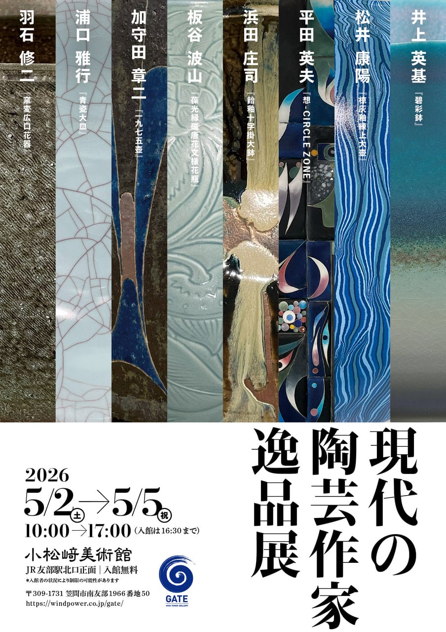 2026.03.31 最新情報「GATE」情報 「現代の陶芸作家逸品展」を開催します。 ウィンド・パワー・ギャラリー「GATE」 小松﨑美術館では、5月2日から5日まで、「現代の陶芸作家逸品展」を開催します。板谷波山、浜田庄司から現代を代表する作家までの逸品をどうぞお楽しみください。