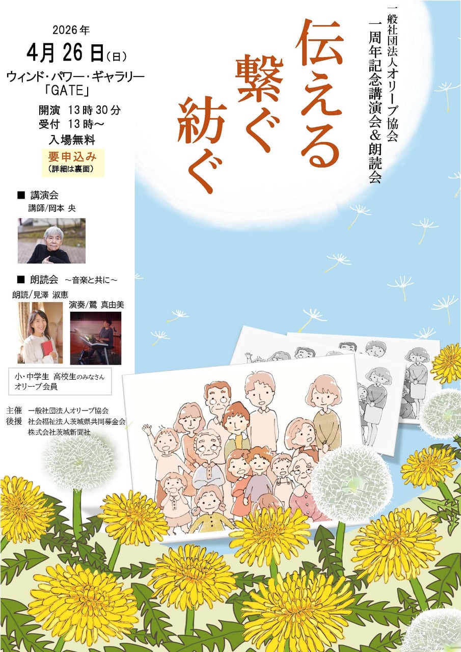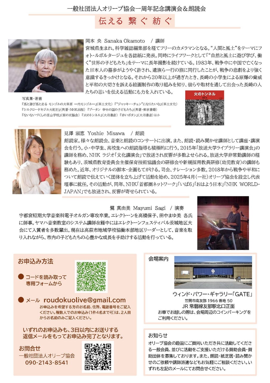 2026.03.27 最新情報「GATE」情報 講演会&朗読会「伝える 繋ぐ 紡ぐ」が開催されます。 4月26日(日)、ウィンド・パワー・ギャラリー「GATE」 において、講演会&朗読会「伝える 繋ぐ 紡ぐ」が開催されます。是非ご参加ください。